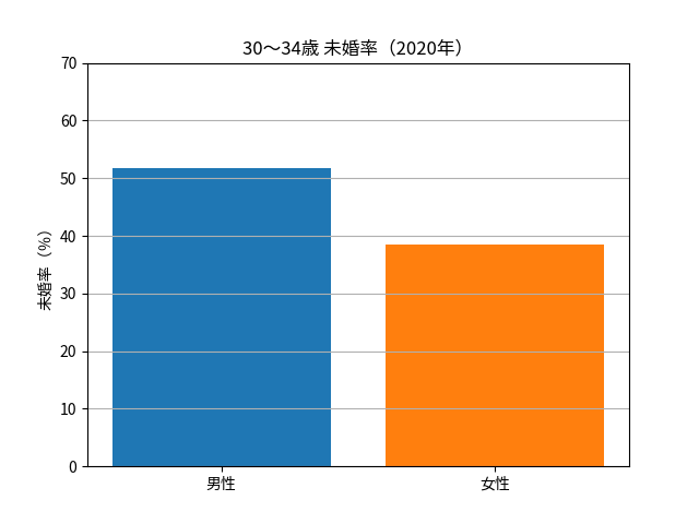 総務省の国勢調査によると、2020年時点で30〜34歳男性の未婚率は約51.8%です。